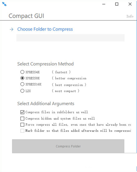 Win10自带了一个非常有效的硬盘压缩功能,压缩游戏文件大小的同时,还不会对实际的游戏性能带来影响,而国外网友也制作了一个更简洁好用的UI界面,并命名为CompactGUI,方便玩家们进行使用。