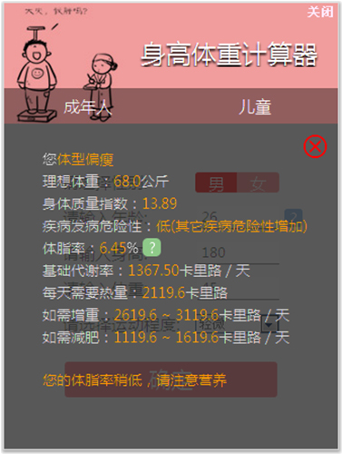 身高体重计算器是用于计算身高体重比例同时提出营养建议的工具。他能计算出儿童和成人的身高体重情况,效的提出一些建议。身高体重计算器提供儿童身高体重和成年人身高体重计算两个功能,根据你的当前年龄来计算身高体重,并提供一些有关健康的建议。
