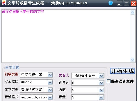 使用语音自动生成器转换语音之前可自定义引擎类型、文本编码、文本类型、音频格式、音频编码、压缩等级、发音人、背景音、语速、音量等选项。通过该软件制作免费的语音可以用作mc喊麦说话开场,也可以录制文字表白情书。生成的语音文件在软件运行目录!