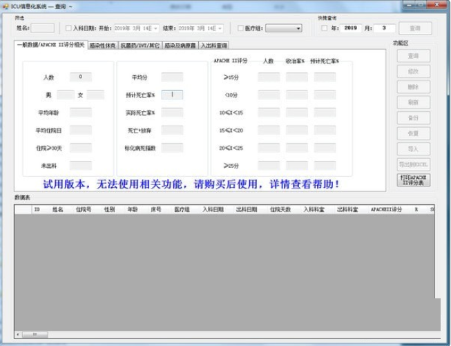 3.功能区:可以进行修改、删除、备份及恢复数据库、导入、导出到EXCEL、打印APACHE II评分表等功能