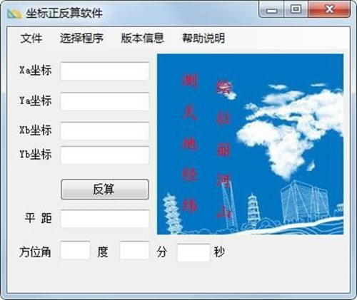 输入已知点A,B坐标,点击“反算”按钮即可计算AB距离以及AB方位角。本软可以计算坐标正反算,由起始坐标、坐标方位角和距离实现坐标正算功能