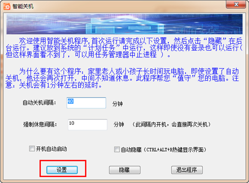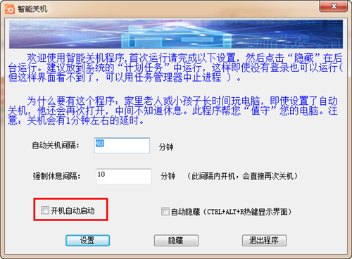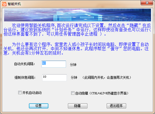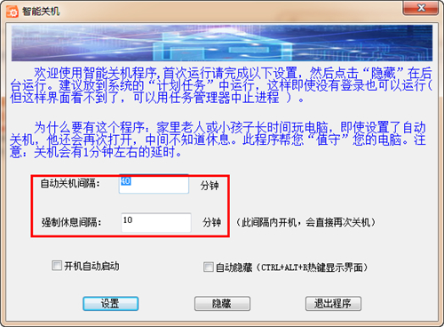 智能关机软件官方版是一款界面简洁、简单易用的家用智能关机工具,智能关机软件官方版非常适合家里的小孩子,防止他们长时间玩电脑,中间不知道休息,而家用智能关机程序就能帮你管理你的电脑,设置定时关机来进行智能开关机操作,非常给力!