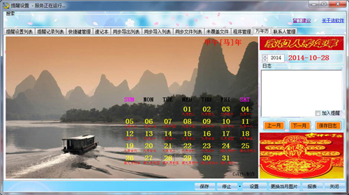 速记本,界面取色(ALT+F2调用),屏幕截图(ALT+Z调用),万年历,程序管理,联系人管理(支持自动发送生日邮件/短信祝福),快速收发邮件短信(ALT+F3调用)等功能