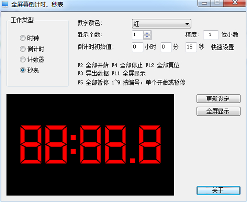全屏幕倒计时秒表时钟计数器官方版是一款小巧方便的这全屏幕计时器软件,使用空格开始暂停操作。全屏幕倒计时秒表时钟计数器官方版可以显示时钟、倒计时、计数器、秒表。显示颜色完全自定义,用于演讲、会议、比赛等场合!