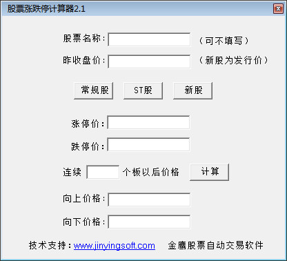 股票涨跌停计算器官方版界面美观实用,轻量快速,功能强大。便于大家计算持续涨停和跌停后的价格,也可以常规股、ST股、新股的涨停价和跌停价,非常适合于抢涨停和新股的网友们。是一款非常不错的软件。