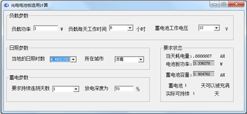 1、光电电池板选用计算输入负载参数和负载每天工作时间,蓄电池工作电压,以及当地有效日照时间,光电电池板选用计算免费版可计算出当蓄电池充满电时间,以及实际可工作时间。