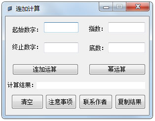连加计算器官方版是一款简单易用的计算器软件,软件可以进行连加、幂次方运算,非常简单方便。只需要输入始数字、终止数字和底数以及指数就能马上得到结果。需要注意的是起始数字和终止数字输入必须是整数,不得输入小数点或其他符号,以及输入的起始数字必须小于等于终止数字!