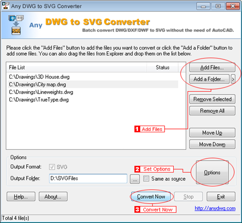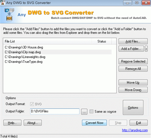 Converter官方版界面美观大方,功能强劲实用,适用范围广泛。软件不仅功能强大,而且完全免费,实用性强、易于上手。是一个易用的DWG转SVG工具,可以帮助用户把任何DWG、DXF以及DWF格式的文件转换为SVG,支持批量转换,支持命令行,而且转换质量非常高,使用起来也很方便,是DWG文件转SVG的最佳解决方案。