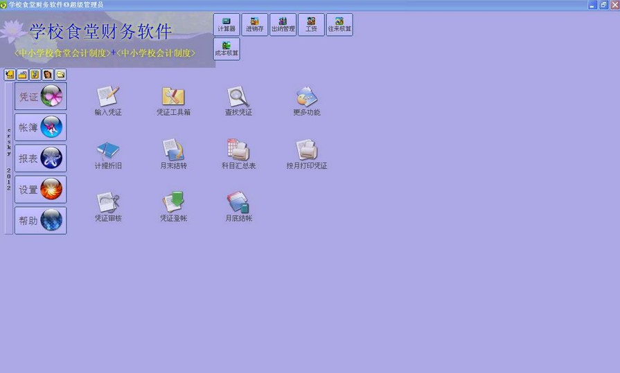 凭证:凭证输入,导入导出;凭证工具箱;查找凭证;自动计提折旧;自动结转;凭证审核;凭证登帐;按月打印凭证;A4纸打印凭证;套打专用凭证纸……