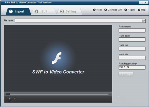 在“导入”页上,单击“浏览器”按钮添加一个SWF文件。您可以获得有关此文件的Flash信息,并在转换之前预览它。