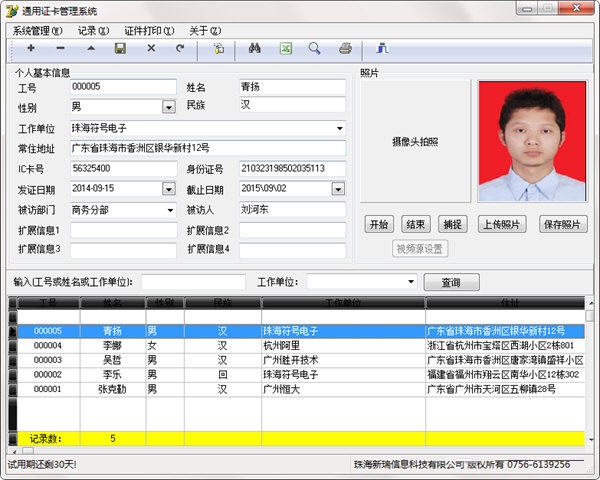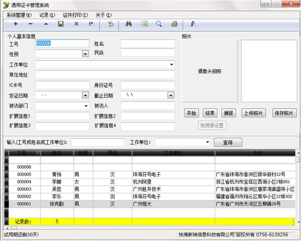 对人员基本信息的“新增、删除、修改、取消、保存、打印、预览、批量导出EXCEXL表,”等操作。通过摄像头可以现场拍照或上传照片,方便证卡的制作。