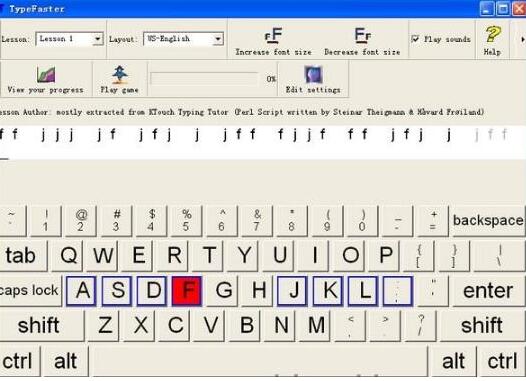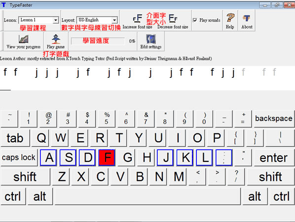 2、要开始练习时,配合指法将范本内的字母输入,课程的练习进度会出现在上方的进度条;完成练习,便会出现统计;另外可在 Lesson