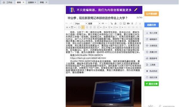 编辑人员可根据选题任务确认文章选题范围,可从word、链接等导入文章,进行质量检测,最后提交文章给审稿人员;