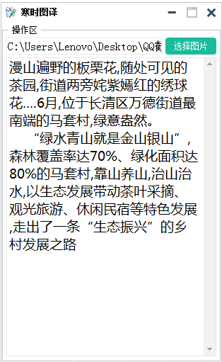 ??寒时图译官方版是一款具有多种功能为一体的图片文字识别软件。软件界面简洁,使用方便,界面与操作完全一致。能够帮助用户一键轻松识别出图片中的文字,节省用户的时间,软件绿色无需安装,可以使用这款完全免费的寒时图译,上传图片或者在线截图即可自动转化成文字。