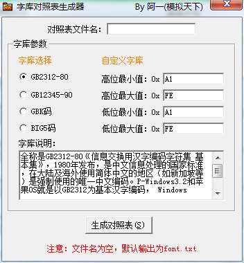 ??字库对照表生成器官方版是一款具有多种功能为一体的生成字体对照表软件。软件界面简洁,使用方便,界面与操作完全一致。可以生成任意大小的点阵中文和英文字库,支持简体中文GB2312和英文ASCII。软件界面简洁,功能强大,使用方便,有需要的用户可以直接下载!