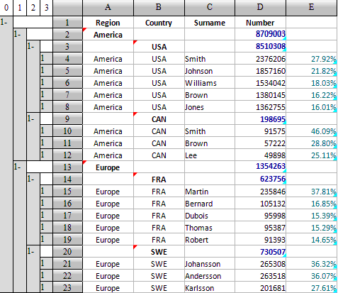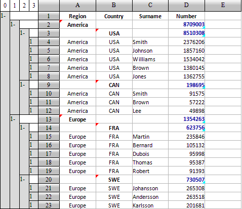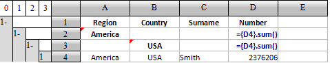 可以看到,各个国家以及各个地区中的人数合计全部计算出来,点击D9,可以查看到其中的公式为={D10}.sum(),点击D13可以看到其中的公式为={D15}.sum(),可见公式根据同位格所在的位置自动迁移了,并且根据所在的位置自动解析计算,如D9中计算加拿大记录的总人数,如D13中计算欧洲记录的总人数。