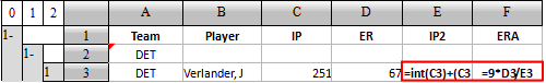 为了计算ERA,首先需要核算投球局数IP,将其中的小数部分,按照每0.3相当于1局转换,公式为IP2=int(IP)+(IP-int(IP))/0.3,然后计算ERA,公式为ERA=9*ER/IP2。在计算表中,只需要在其中的任一个同位行中填入公式即可,如在E3中填入公式=int(C3)+(C3-int(C3))/0.3,在F3中填入公式=9*D3/E3: