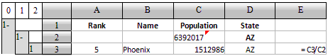 这样就可以计算各个城市在本州的人口占比了,在E3中填入公式=C3/C2: