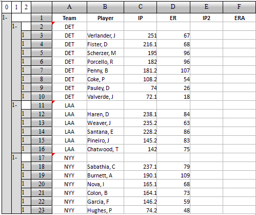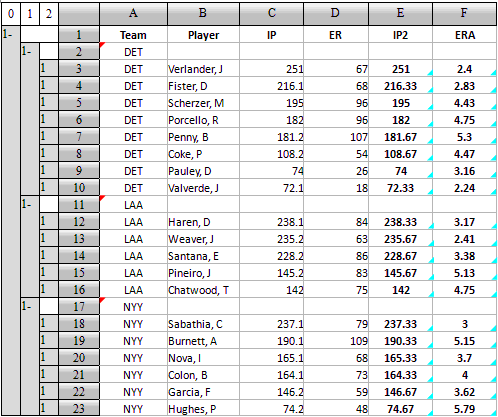 下面是一些棒球队中投手的一些技术数据,现在需要计算出每位投手的防御率(Earn Run Average[ERA]):