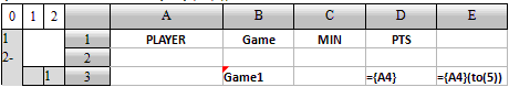 在第1行后面添加续行,准备存储计算结果,并将比赛数据收缩到场次,在D列中计算每场比赛的得分球员,E列中计算每场比赛得分前5名的球员,为此,在D3中填入公式={A4},在E3中填入公式={A4}(to(5)):