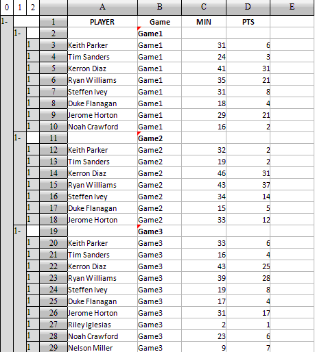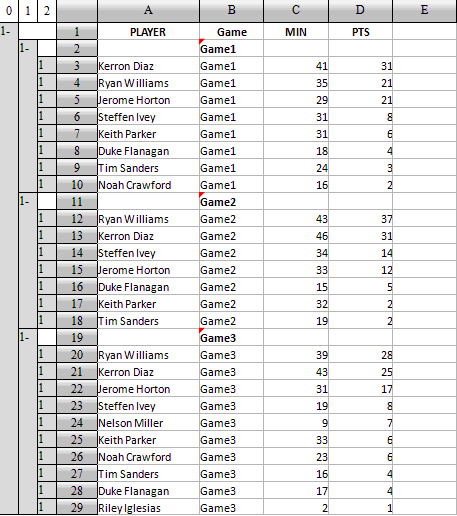 先将每场比赛中的球员按照得分排序,为此选择D3,执行降序排序: