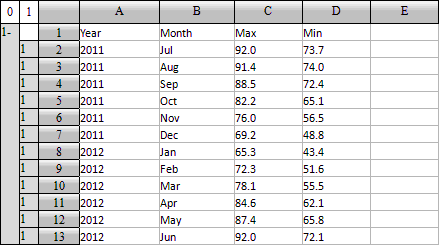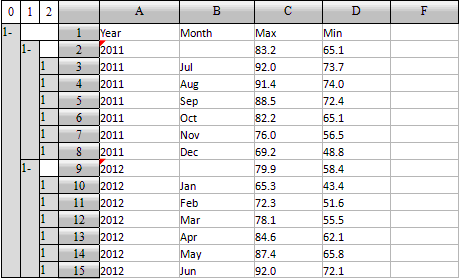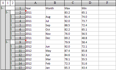 如,可以将每个分组中数据排序,将每一年的数据按平均最低气温降序排序。为此,选择D3执行降序排序,各个分组中的记录都会执行,结果如下:
