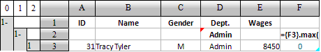 在每个部门的汇总行中计算女员工的最高薪水,为此,在F2中填入公式={F3}.max(),如下: