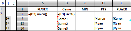 计算出结果,并在A2中填写公式={D3}.union()计算所有得分球员,B2中填写公式={E3}.isect()计算各场得分均在前5位的球员,如下: