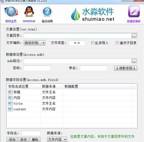 代表txt或html扩展名的文件mdb路径:可以指定一个已经存在的mdb文件路径,如果不存在,在导入时将自动创建(根据 数据字段设置 自动指派字段)。