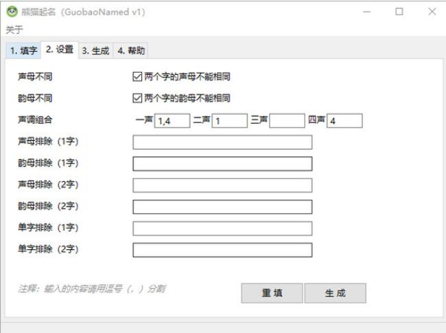 声母韵母不同:指的是名字的两个字的声母和韵母不能相同。(解决绕口问题) 声调组合:文字代表的是第一个字的声调,输入框内填写第二个字的声调。 声母韵母排除:排除特定读音的汉字。用逗号分隔。 单字排除:排除特定汉字。