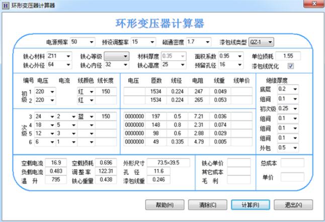 ??1.可自定义电源频率、预设调整率、磁通密度、漆包线类型等,可查看铁心材料、铁心外径、铁心等级、铁心内径、材料厚度、铁心高度、面积系数、预留孔径、单位损耗等信息。