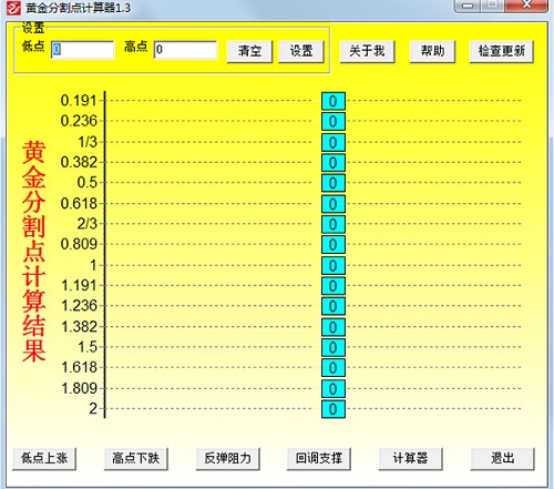 2、只需输入上一波行情的高点和低点,即可算出黄金分割法的各个点位(也包括其它关键位置 比如1/3 、1/2、2/3等),计算非常方便。