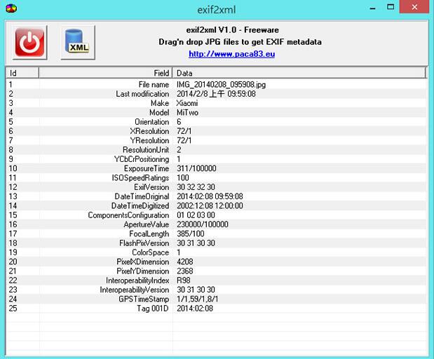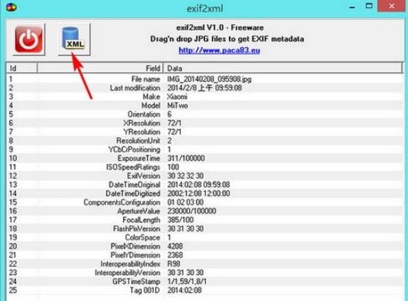 ??1.解压缩所下载的档案,执行“exif2xml.exe”便可开启,无须安装。开启后,将相片使用滑鼠拖拉到介面空白处,即可显示该张相片的 EXIF 资讯,点击上方有 XML的按钮,便可转出。
