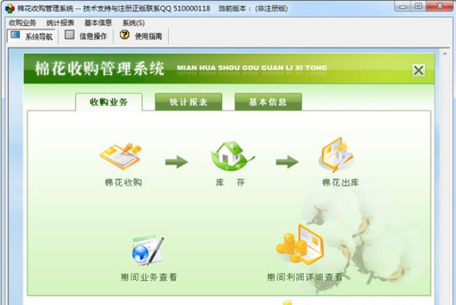 2、收购业务:棉花收购、收购出库、库存明细、期间业务查看、期间利润详细查看;