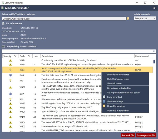 检查GEDCOM 5.5、5.5.1和5.6文件的有效性。搜索并保存报告的所有问题的列表。