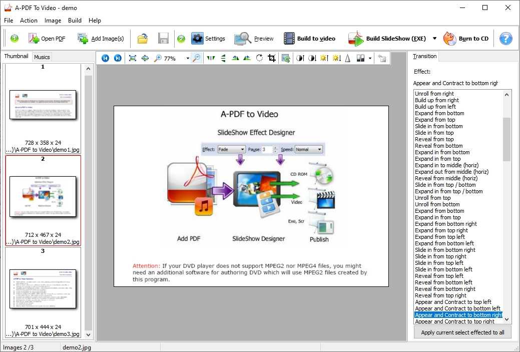 A-PDF To Vide最新版使用了许多淡入淡出的效果,使您的图片栩栩如生。它使用任何计算机都具有的2D硬件加速功能,包括旧型号的笔记本电脑。因此,创建的幻灯片不需要任何特殊的硬件,软件或任何文件即可运行。您的所有PDF页面和音乐文件都包含在独立的.EXE,.SCR或MPEG视频文件中。