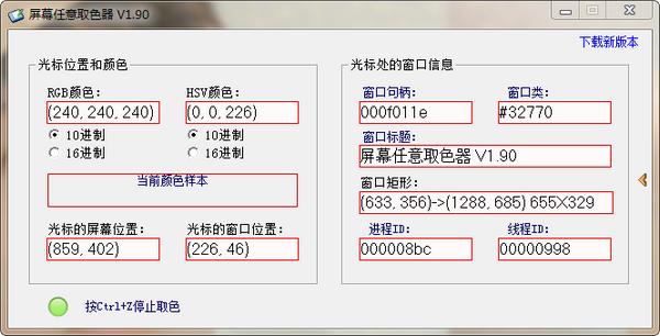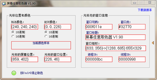 支持RGB颜色和HSV颜色双显示,支持10进制和16进制双选项。HSV颜色模型显示的色调、饱和度和亮度的取值与Windows上的画图程序的取值完全一致。