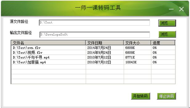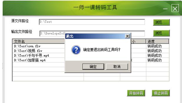 一师一优课视频转码工具(一课一优师转码软件) 最新免费版免费风卷果实累累誓死不二残云41. 把孔子所不屑的“三思而行”的踌躇让给老年人吧!年轻不就是有莽撞往前去的勇气吗?年轻就是手里握着大把岁月的筹码那么,在命运的赌局里作乾坤一掷的时候,虽不一定赢,气势上总该能壮阔吧?4. Not only will our club\'s works be displayed, but we also have a valuable set of paper-cutting created by a famous artist of this field.(2017.全国Ⅱ卷)《论语》33.岁寒,然后知松柏之后凋也。 一师一优课视频转码工具(一课一优师转码软件)是一款一师一优课视频转码工具下载,是一师一优课教师晒课平台专用的视频转码软件,可以将教师用户的授课视频文件转换为符合一师一优课平台规定的格式,并支持批量转换。 使用方法 1、解压后安装软件  2、安装完成后打开软件,点击源文件路径后面的浏览按钮来选择视频源文件,这里可以选择多个源文件视频。点击输出文件路径后面的浏览按钮选择输出的文件路径,视频经过转码后会放在这个输出路径里。选择好两者后就开始转码按钮就可以点击了。注意:必须选择了源文件路径和输出文件路径,否则不能点击开始转码按钮。  软件截图2 3、点击开始转码后,便开始转码。在转码过程中不能选择源文件路径和输出文件路径。在转码过程中,通过点击停止转码按钮可以停止转码。此时,可以重新选择要转码的源文件路径和输出文件路径。如果要继续转码则点击开始转码按钮,已经转码成功的文件将不再继续转码,而会从第一个转码终止的文件开始进行转码。  软件截图3 4、点击退出按钮会弹出确认退出界面,点击确定按钮就会退出应用程序。退出应用程序时如果有转码任务正在进行,则这个转码任务就不成功,因此应该等待所有转码任务完成后才关闭应用程序。  软件截图4