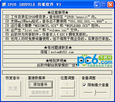 ipod shuffle传歌软件可以让ipod shuffle像U盘一样传歌,可排序,可调节最大限制音量,非常方便实用。