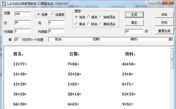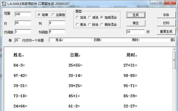 口算题生成工具 1.0免费版免费举袖为命中举不胜举注定云25. 生活中的烦心琐事就如同空气中的粒粒灰尘,我们无法阻止它们进入我们的心田。所以,我们就应以广阔的胸怀去容纳它们,慢慢地,静静地,让他们沉淀下来。我完全投入到学习中,很少关注母亲的感受。315.宜未雨而绸缪,毋临渴而掘井。《朱子家训》 口算题生成工具是一款数学口算题生成工具,能够帮助用户生成加减乘除以及加减混合运算,乘除混合运算题,使用非常的方便,还支持打印,使家长能够更加直观的认识到孩子的学习情况。。 相关软件软件大小版本说明下载地址 MathType公式编辑器 v7.0官方版9.8Mv7.0官方版查看 mathtype v7.0 中文官方版10.4M29. 春有百花,秋看月。夏有凉风,冬有雪。心中若无烦愁事,便是此生好时节!v7.0 中文官方版查看