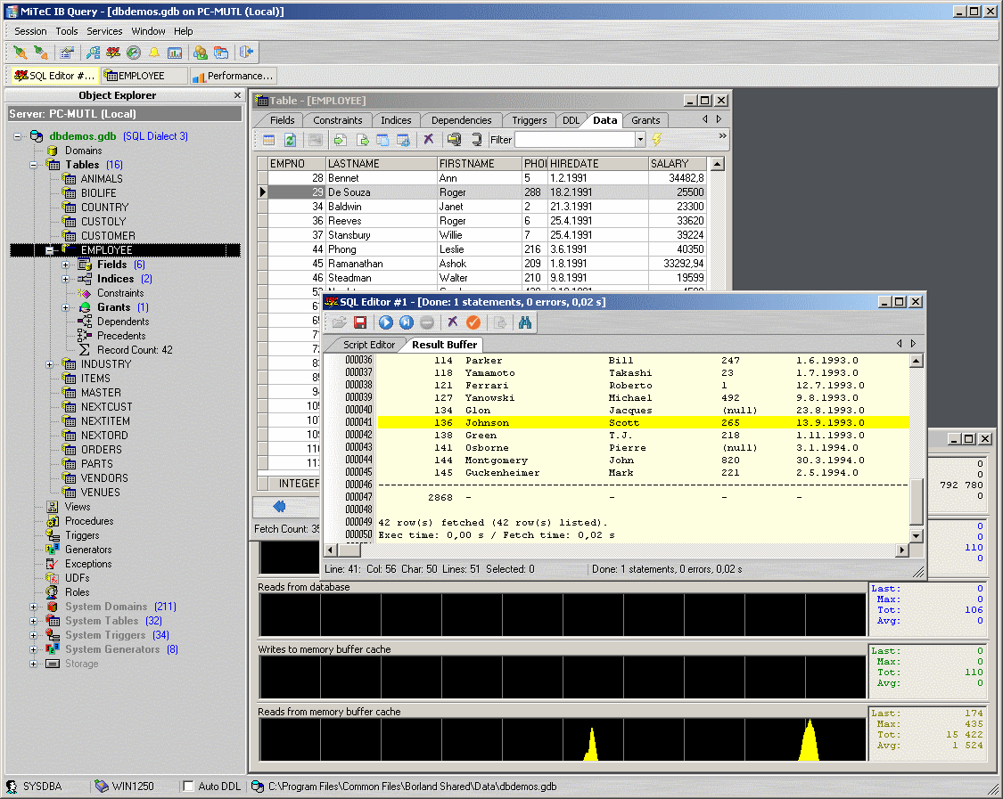 它包含语法与结果缓冲高亮显示的SQL编辑器。您可以运行任何SQL语句或脚本的类型。刷新到输出格式的文本,而不是网格,它允许更灵活的概述。