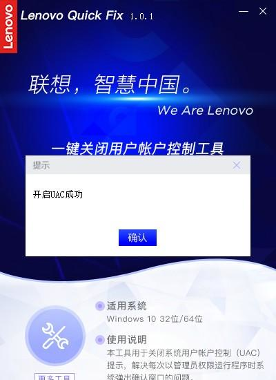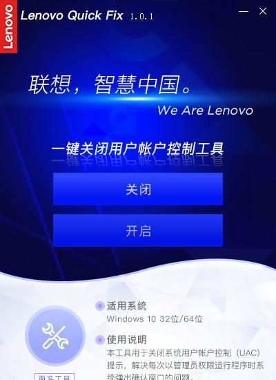 联想一键关闭用户帐户控制工具 1.0.1 官方版免费一叶扁千锤百花样多(五花八门)炼舟21. 阳光照在波光细细的湖面上,像给水面铺上了一层闪闪发光的碎银,又像被揉皱了的绿缎。35.打下坚实的基础 lay a solid foundation for…395.红军不怕远征难,万水千山只等闲。《七律?长征》 联想一键关闭用户帐户控制工具用于关闭系统用户帐户控制(UAC)提示,解决每次以管理员权限运行程序时系统弹出确认窗口的问题。有需要的用户可以下载。  使用方法 双击运行“一键关闭用户帐户控制工具.EXE”,可能出现的用户账户控制提示,请选择“是”。如图1:  软件截图2 图1 一键关闭用户帐户控制工具操作首页。如图2:  软件截图3 图2 点击“关闭”按钮即可关闭用户帐户控制(UAC)提示,提示关闭UAC成功,如图3:  软件截图4 图3 点击“开启”按钮即可开启用户帐户控制(UAC)提示,提示开启UAC成功,如图4:  软件截图5 图4 若您的电脑还有其他疑难问题可通过工具操作页面上的“更多工具”按钮获取我们更多其他工具的详情!如图5:  软件截图6 图5