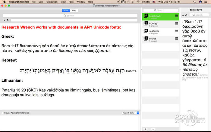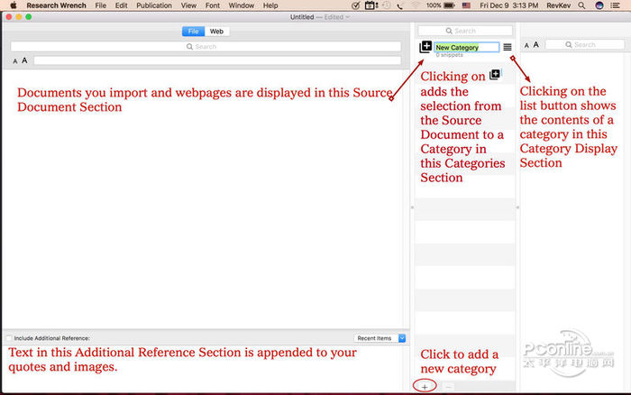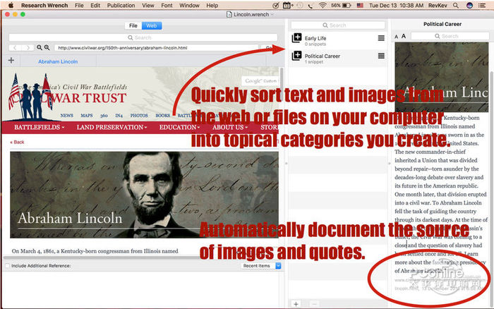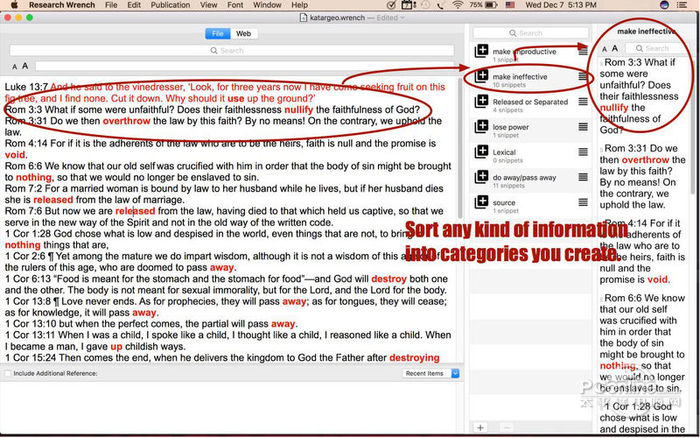 Research Wrench accelerates study and research for Mac users who are ? College Professors/Lecturers ? College students ? Graduate students ? Teachers ? Lawyers ? Journalists ? Preachers ? Public speakers ? Researchers and ? Report writers Research Wrench slashes the time needed for study and research by: ? Importing almost any kind of file or webpage. ? Allowing you to sort text and images from that file into categories you create. ? Automatically documenting the source of each clipping. With just the click of a button! ? Keeping you moving through documents ? Keeping you focused. Please, watch the 4 minute demo! You will be amazed.  Research Wrench Mac版 截图1 Research Wrench的新功能