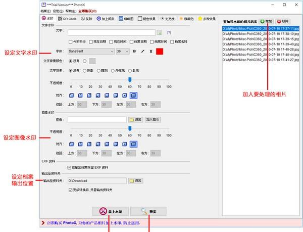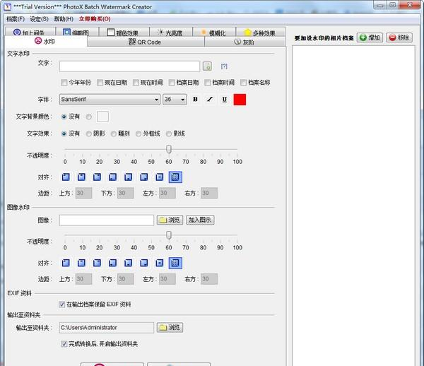PhotoX是一款图片水印工具,可以帮助用户批量给图片添加水印,支持文字水印及图片水印等,还可以添加二维码,可以根据需要对水印进行制作,设置颜色及大小,位置等。  功能介绍 1、快捷简易加上水印 一个步骤同时为多幅相片加上水印。只需简单一按,多幅相片均被盖上相同的水印。 2、配合公司形象 可以使用公司标志或其他图像作为水印,亦可自行订定文字水印的风格,包括字体, 大小, 粗体, 斜体, 下划线和颜色。 3、不会覆盖或影响相片 你可以调节水印的透澈度,避免覆盖图像;水印亦可效置在相片上不同的位置。 4、支援不同类的相片 BMP, JPEG (JPG), PNG, PNM, RAW, TIFF, WBMP, etc 5、额外工具保护你的相片 除左为相片加上水印外,软件内亦有多个额外工具保护你的相片。 QR Code - 在相片加上 QR Code 二维码 灰阶 - 将你的相片转换为灰阶 加上间条 - 在相片上加上间条 缩略图 - 为你的相片制作缩略图 褪色效果 - 加上褪色效果, 覆盖相片 光亮度 - 调整相片的光亮度和对比度 模糊化 - 将你的相片变成模糊 6、同时在相片加上多种效果 你可以在相片上同时加上多种效果以保护相片,例如:你可以在相片加上水印并转为灰阶化相片。  软件截图2 使用方法 1、加入相片以作处理 在画面的右方,可以加入需要处理的相片档案。 2、制作水印 在画面的左方,设定你的水印,可以加上文字水印和图像水印,设定水印的透澈度, 摆放位置等。还可以为文字水印设定字体, 大小不同的风格。 3、预览和输出 当预备了相片档案和水印,按下方的按钮进行预览或制作输出品。 谁知错管春残事,到处登临曾费泪。此时金盏直须深,看尽落花能几醉。思欲委符节,引竿自刺船。PhotoX(图片水印工具),PhotoX(图片水印工具)下载,图像处理,图形图像8、Faith can move mountains. |