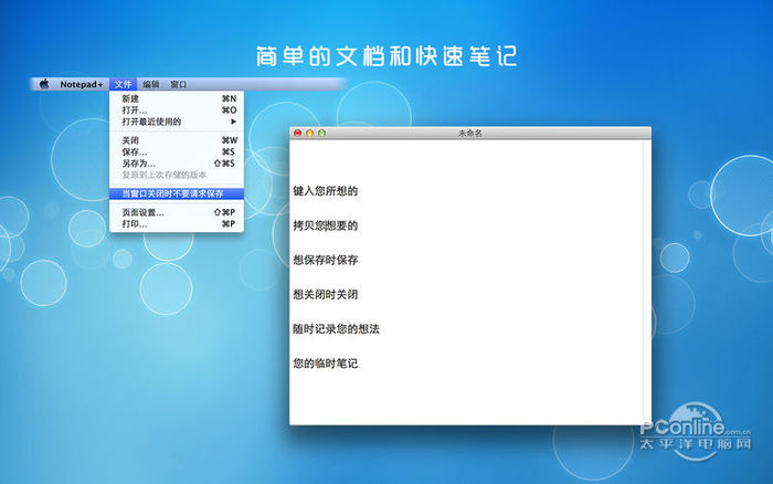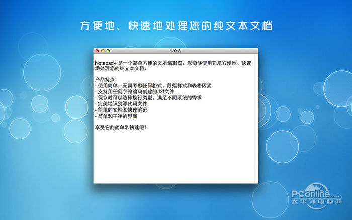 Notepad+ Mac版 1.0.0收费行动迟满班门弄斧城风雨缓28. 没有清醒的头脑,再快的脚步也会走歪;没有谨慎的步伐,再平的道路也会跌倒。6. The reason why people choose to live in the city is that the life is more convenient and colorful.213.人世几回伤往事,山形依旧枕寒流。《西塞山怀古》 Notepad+ 是一个简单方便的文本编辑器。您能够使用它来方便地、快速地处理您的纯文本文档。 产品特点: - 使用简单,无需考虑任何格式,段落样式和表格因素 - 支持用任何字符编码创建的.txt文件 - 保存时可以选择换行类型,满足不同系统的需求 - 完美地识别源代码文件 - 简单的文档和快速笔记 - 简单和干净的界面 享受它的简单和快速吧! 反馈:任何建议将不胜感激,支持邮箱:maizi_01993@sina.com  Notepad+ Mac版 截图1 Notepad+的新功能