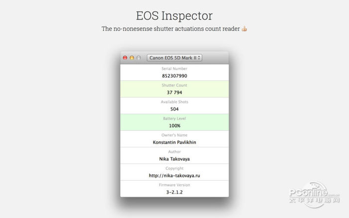 EOS Inspector Mac版 1.1.0收费春冷若冰霜风化慎言谨行雨38. 亲情能点燃生活的希望,为我们撑起心灵的蓝天;它是一种沾了点汗、湿了点泪、带了点痛的,是一种平凡而伟大的美丽。在他们的帮助下,我取得了很大进步。(2009.福建)311.驿外断桥边,寂寞开无主。已是黄昏独自愁,更著风和雨。无意苦争春,一任群芳妒。零落成泥碾作尘,只有香如故。《卜算子?咏梅》 The no-nonsens17. 一生情,蜿蜒成潺潺的溪水,向着爱海奔腾而去;一生爱,辗转成绵延的相思雨,踏落一路红尘的情趣;我的爱总是为了你,把你留在我香甜的梦境里!e shutter actuations count reader. Whether you are buying a used Canon EOS camera or just giving attention to your existing photo gear it is sometimes useful to know how many shots a particular camera has taken. The modern DSLR’s shutter has pretty big, but still limited resource, that varies in 100,000–150,000 shots range. Unfortunately, for some reason Canon decided to hide the diagnostic info from user’s eye. That’s where EOS Inspector comes into play! Download the app and connect your Canon EOS camera via USB cable to get accurate shutter actuations count measurement. For information about camera compatibility please refer to the support page.  EOS Inspector Mac版 截图1 EOS Inspector的新功能