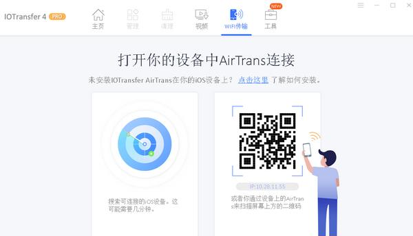 IOTransfer Pro是来自国外的一款免费的苹果手机管理软件,软件拥有中文界面,通过IOTransfer Pro用户可以对IPHONE、ipad或者IPOD上的所有媒体文件进行管理,同时软件还有类似iTunes的功能,非常方便,使用IOTransfer Pro还可以从电脑对设备进行无线传输和媒体文件下载,是一款非常棒的IOS管理工具。  功能介绍 1、轻松的照片管理器 - 保留最好的时刻最好的iPhone照片管理器 快速安全地,IOTransfer将照片传送到iPhone,iPad和PC。随时随地保留并分享您最好的时刻。将照片/图片从计算机导入iPhone而不使用iTunes或iCloud。导出或删除照片在一个点击释放更多的空间在iPhone。 2、以您喜欢的方式管理iPhone / iPod音乐,适用于iPhone的最佳音乐传输工具 IOTransfer可以轻松地在iPhone,iPod,iPad和PC之间传输音乐,既不删除源音乐,也不事先进行任何备份。批量传输需要更少的时间来传输,而更多的时间可以在不同的设备上欣赏音乐。所以你可以随时随地和亲朋好友分享你最的音乐。 IOTransfer还可以将电脑上下载的音乐传输到iPhone / iPod / iPad,而无需使用iTunes。随时随地享受音乐,无任何边界。 3、享受您的视频和电影 将您的iPhone或iPad上的视频或电影拖放到电脑上。将您最喜欢的视频保存到您想要的任何位置。您可以在不同的苹果设备上欣赏所有视频和电影的相当好的体验。简单快捷! 4、备份iPhone数据 通过转移到PC来备份您的iPhone数据,防止由于错误删除,iPhone损坏或窃取而导致的数据丢失。除了传输照片/音乐/视频外,IOTransfer还可以有效地支持联系人,消息,应用程序,播客,书籍和语音备忘录等。快速稳定。 使用方法 一、下载安装软件,点击,安装苹果驱动组件。  软件截图2 二、点击WIFI传输,点击开始传输进行文件传输。  软件截图3 三、扫码即可连接电脑使用传输功能。  软件截图4 四、在小工具处还能免费使用很多小工具,非常方便。  软件截图5