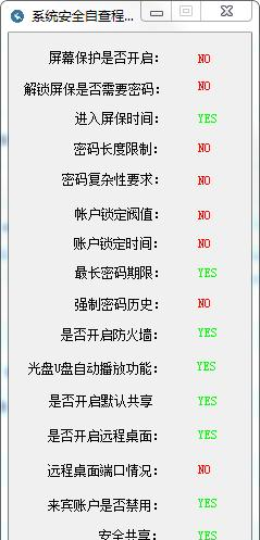 系统安全自查程序 1.0 绿色版免费一个愿打江水茫茫,一水泄不通个愿挨8. 九月一到,就有了秋意,秋意在一个多雾的黎明溜来,到了炎热的下午便不见踪影。它踮起脚尖掠过树顶,染红几片叶子,然后乘着一簇飞掠过山谷离开。20. If you are interested in what I have stated above, sign up on our school website before September 1st.(2017.全国Ⅱ卷)80.尽信书,不如无书。 系统安全自查程序是一款个人制作的小巧软件,通过系统安全自查程序用户能对自己的电脑进行一个笼统的检测,系统安全自查程序能对最基本的电脑状态进行一个检查,然后判定电脑的安全程度到底符不符合安全需求,如果对自己电脑的安全不放心可以下载一个这个软件进行一次检测。  功能介绍 屏幕保护检测 电脑锁屏密码检测 账户阀定值检测 防火墙检测 电脑共享检测 光盘是否开启检测 远程桌面检测 是否禁用来往账户 安全共享检测 使用方法 一、下载打开软件,软件会自动检测出电脑的一些问题。  软件截图2 二、YES表示符合要求,NO表示不符合要求,接下来就只需要将NO的一些问题修改即可提升电脑安全。