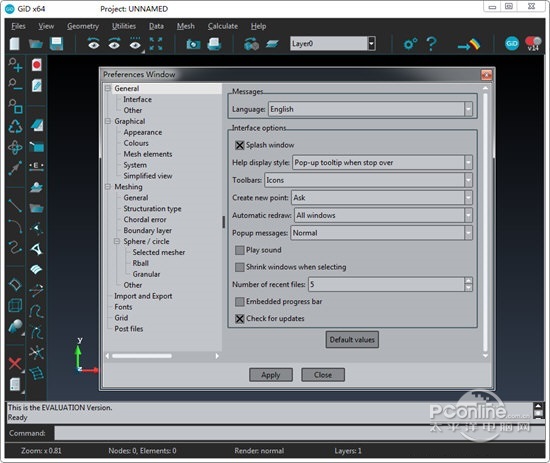 1、GiD:通用,自适应和用户友好的前后处理器 通用:GiD非常适合使用数值方法生成分析科学和工程中任何问题所需的所有信息。 自适应:GiD非常容易适应任何数值模拟代码。GiD的输入和输出格式可以定制,并与任何现有软件兼容。 用户友好:专注于用户需求的开发,为用户提供简单,快速和有效的功能。 2、GiD自适应功能 多语言:GiDGUI适用于任何语言。 多平台:GiD是使用C++,Tcl/Tk和OpenGL开发的,以便为MSWindows,Linux或macOS提供最佳性能和可移植性。 多种计算选项:本地和远程计算(可从GiD远程运行计算的应用程序)。  GiD Professional 第一次启动 一般方面>调用GID 第一次执行GiD时,将显示以下窗口。