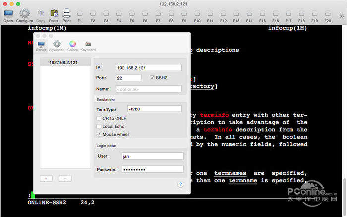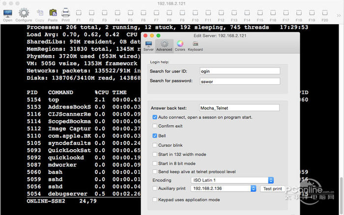 Telnet Lite Mac版 1.2免费亡羊蜻蜓见礼忘义点水补牢如果相信轮回,对缘分就不会感到奇怪。因为人与人之间的关系并非始于今生,还有许多前生带来的烙印。在过去生,有些曾是我们的亲朋故友,有些则是我们的冤家仇敌。当彼此在今生再度相遇,这种烙印就会复苏,并驱使我们将往昔的爱恨情仇继续演绎下去。随着现代科技的迅速发展,互联网已经成为生活和工作中必不可少的一部分。127.不入虎穴,焉得虎子。 Mocha Telnet provides access to a Linux/UNIX Telnet Server. You can connect to a Telnet Server and run applications in a VT220 Terminal window. Exactly as you would, if you were sitting at your system console, just on a smaller screen. Before buying, try our free Lite version. The Lite version does not include F1-F5 + F10-F20 and ESC. FEATURES - Supports all standard VT220 emulation features. - Alternate screen size (24x80 or 24x132). - Ssh2 and telnet protocol. - Auto login. - Auto connect. - Clipboard support. - User defined key values.  Telnet Lite Mac版 截图1 Telnet Lite的新功能
